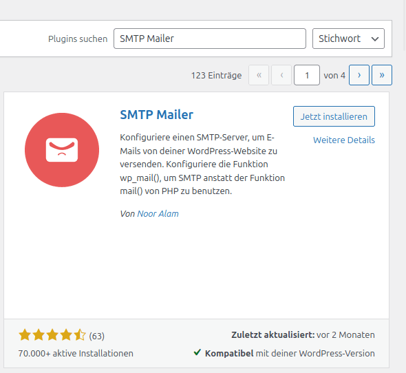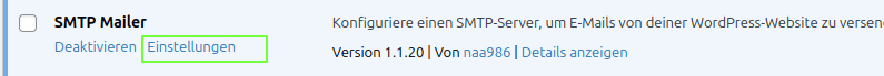 Dort suchst du das SMTP Mailer-Plugin heraus und klickst auf Einstellungen.