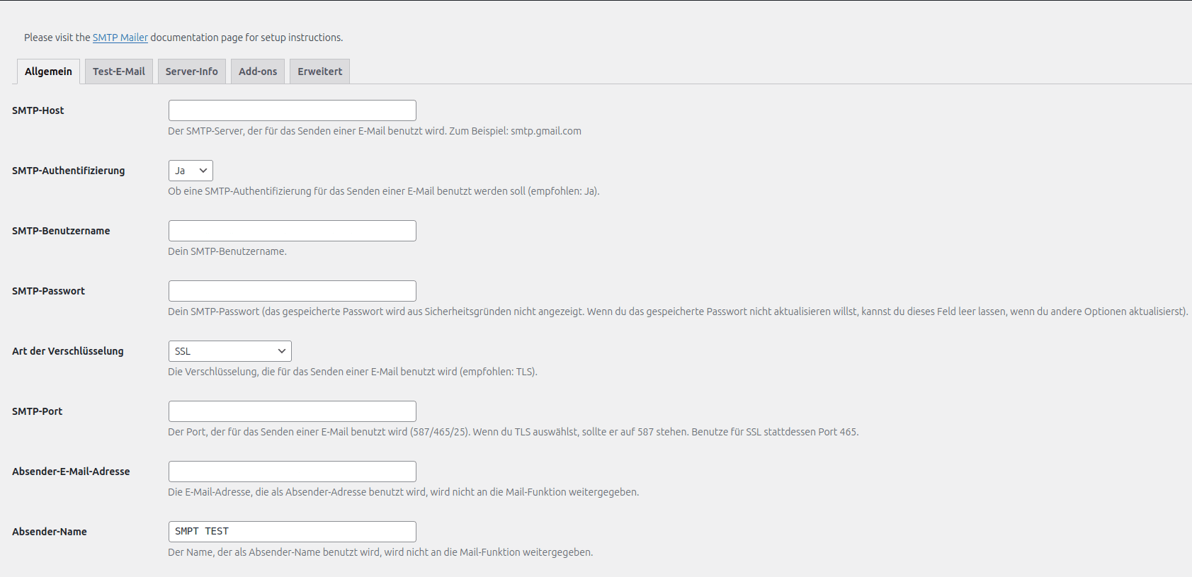 Wenn du oben auf E-Mail testen klickst, kannst du prüfen, ob deine SMTP-Einstellungen korrekt sind.