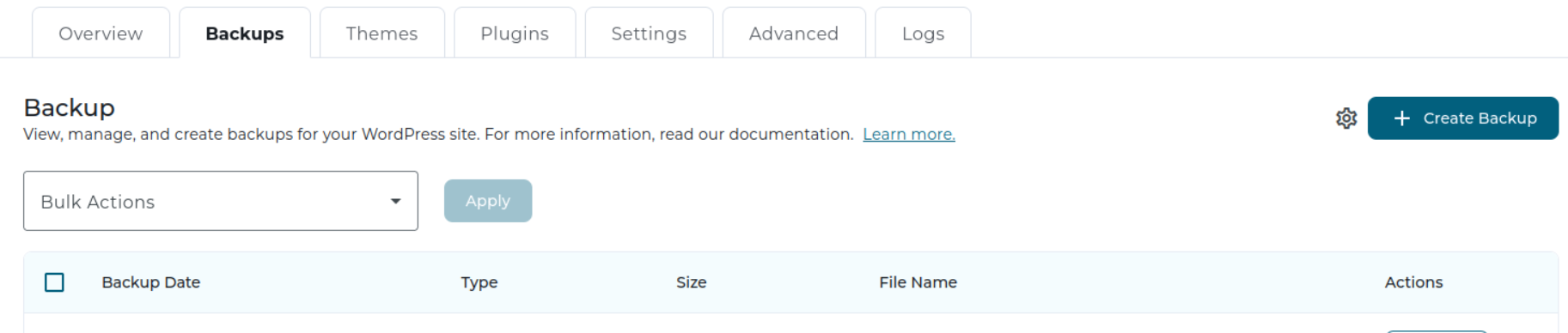 In der WP-Squared-Übersicht im Tab Backups findest du neben dem Button Create Backup zum Erstellen manueller Backups auf der rechten Seite ein Zahnrad-Symbol.