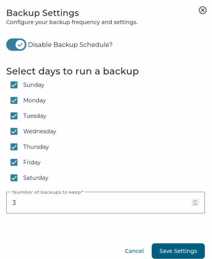 Wenn du auf dieses Zahnrad klickst, öffnet sich ein Menü, in dem du festlegen kannst, wie viele Backups gespeichert werden sollen und an welchen Tagen die Backups erstellt werden.