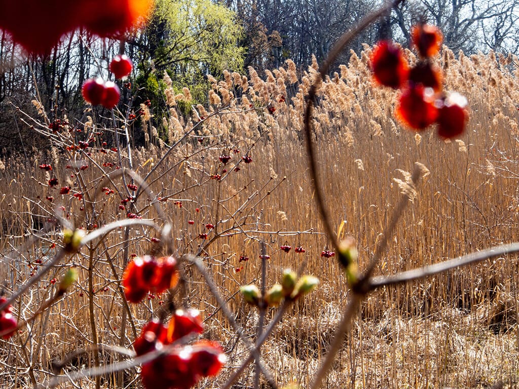 Sehr schnell jedoch übernahm die Intensität der Farben in der scheinbar monoton ockerfarbenen Landschaft die Führung und geleitete mich zu den winzigen, leuchtend roten Beeren an den noch winterdürren Ästen. Die Softbox am Firmament löste sich auf und wich einem eindringlichen Himmelblau. Die Sonne blitze herab und zeichnete die Konturen der Welt um mich herum wie mit Leuchtstift nach. Ich tauchte in ein rauschendes Farbenspiel ein und ein Karussell der Gestaltgebung. Sonnenstrahlen, eine Symphonie aus heiteren Vogelgeräuschen, die warmen Windböen, die bereits den Sommereinzug verkündeten. Romantisierte ich? War es vielleicht doch der aktuelle Sahara-Sturm, der hier sein Post-it an meiner Wahrnehmungsmembran anbrachte? Eine Nachricht des Klimawandels?