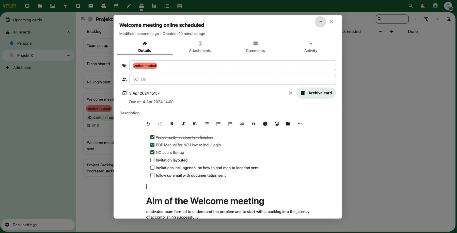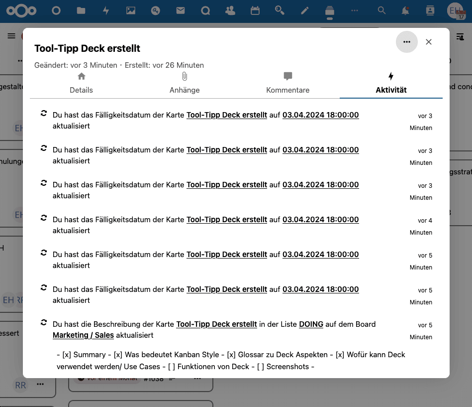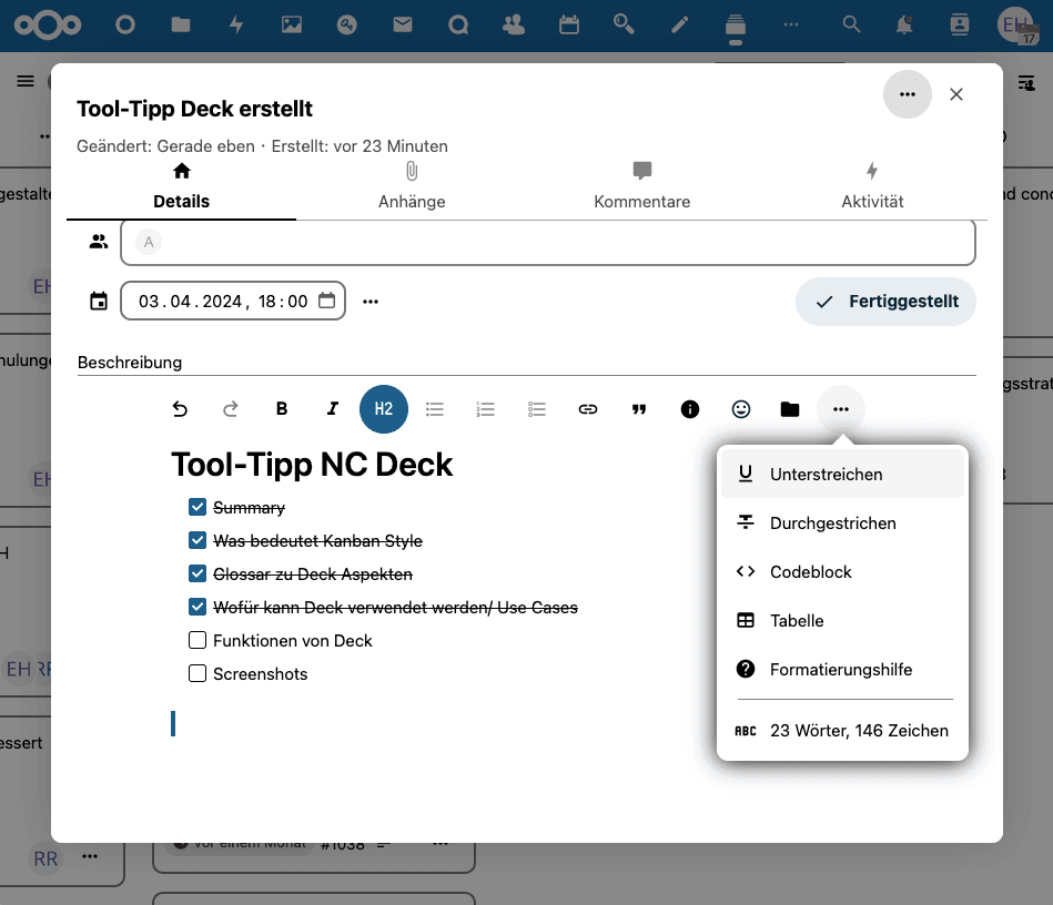 Gibt es ein Fälligkeitsdatum? – Trage es ein. Dein Nextcloud Dashboard oder auch die Deck Übersicht wird dir so die aktuell wesentlichsten Karten priorisiert anzeigen.