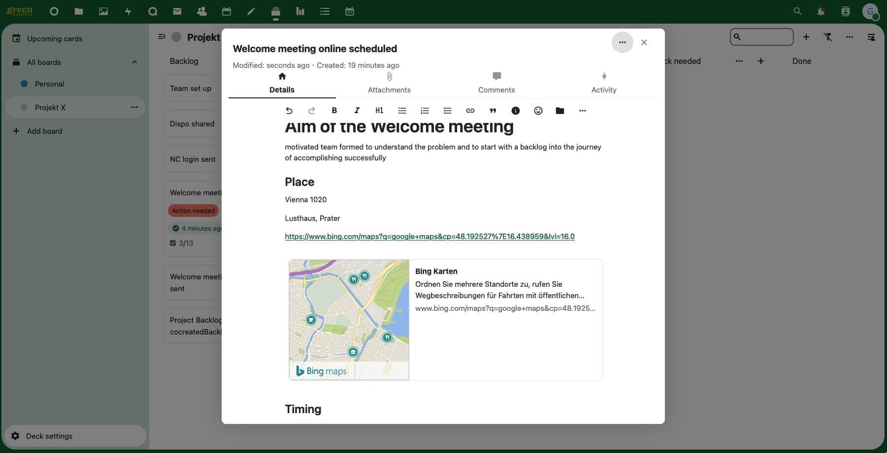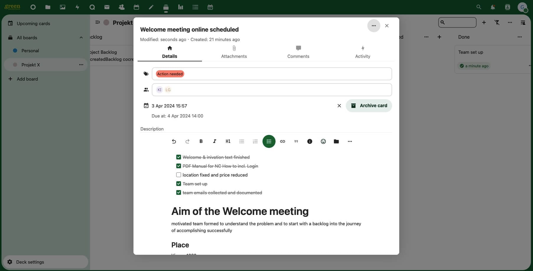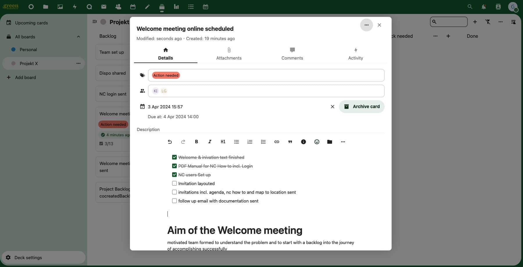 Gibt es ein Fälligkeitsdatum? – Trage es ein. Dein Nextcloud Dashboard oder auch die Deck Übersicht wird dir so die aktuell wesentlichsten Karten priorisiert anzeigen.
