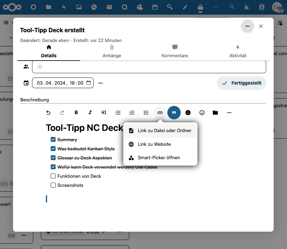 In Deck kann per Smart Picker auf ein Board/eine Karte oder einen Kommentar im Deck verwiesen werden. Mehr zu Smart Picker bald auf Tool-Tipps.