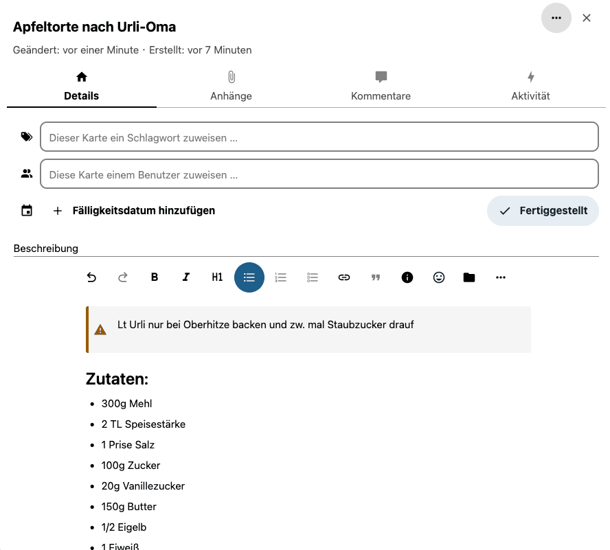 Wenn du nun Karten erstellst, werden diese immer einer Liste zugeordnet. In der Aufgabenplanung wäre hat z. B. eine Karte den Titel „Deck Tool-Tipp erstellt“, oder „Liste Frühlingsblüher“ oder „Rezepte von Oma“wenn ich mir eine Übersicht zu Themen gestalte oder User Stories erstelle. In dieser Karte hast du nun unterschiedliche Möglichkeiten: